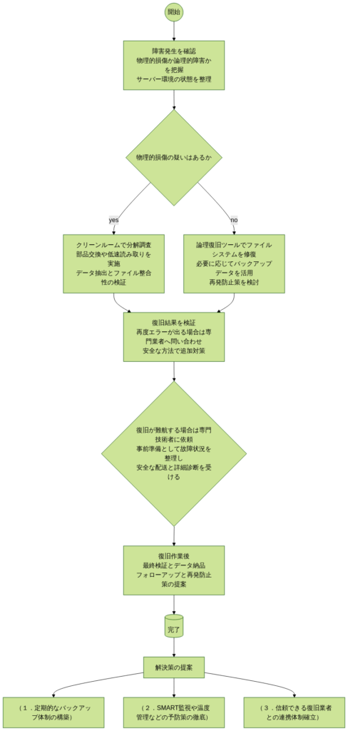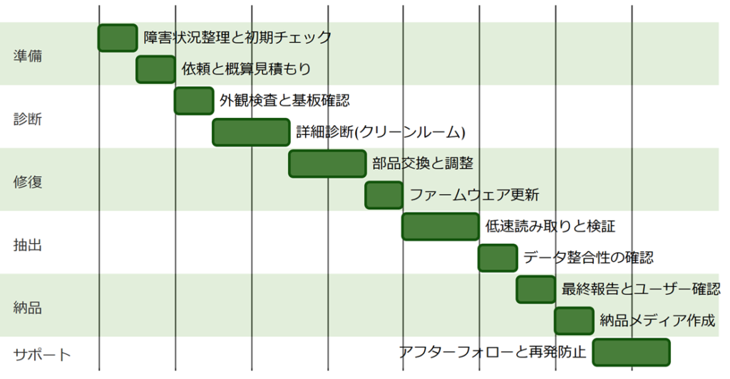・障害原因の大まかな分類(物理的、内部不良、論理的など)の確定 - 所要時間:1~2日以内に初期診断報告を提出